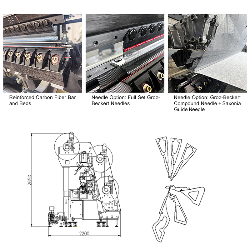| 3. Stäbe/Strickelemente | Einzelne Nadelstange mit zusammengesetzten Nadeln, Zungennadeln und 3 Führungsstangen. Alle Stangen und Betten bestehen aus kohlefaserverstärktem Material. |